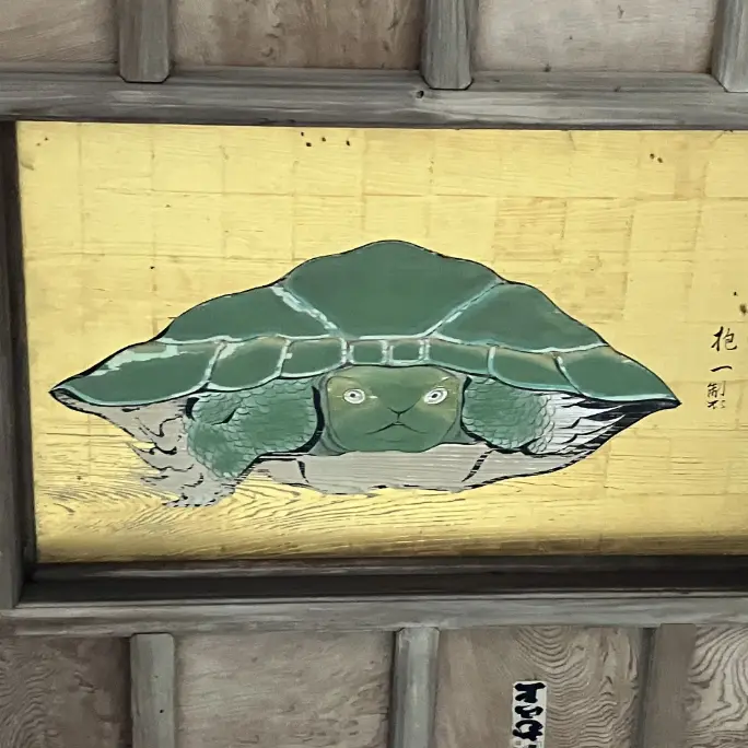 江島神社の奥津宮拝殿天井の「八方睨みの亀」は、1803年(享和3年)に絵師 酒井抱一によって描かれた「正面向亀図」。